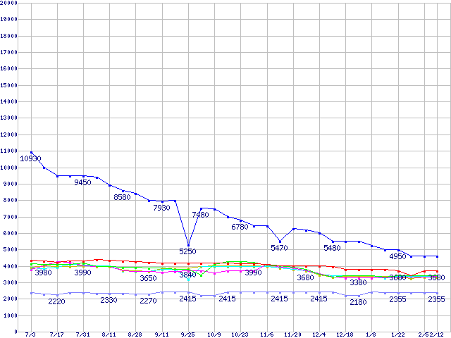 | [↓次グラフ]: | メモリ主要製品(最安値5千円~1万円未満)の最安値推移 |