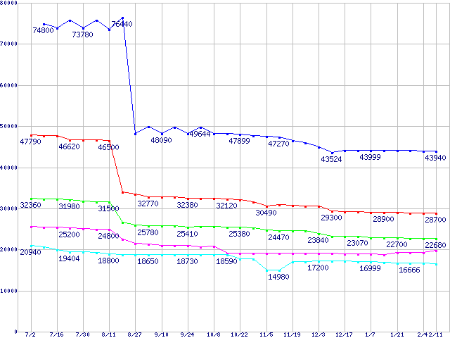 | [↑前グラフ]: | LGA 775 (FC-LGA4 ,FSB 800MHz,L2 1MB,Hyper-Threading,Prescott,NX bit対応,BTX対応)の最安値推移 |