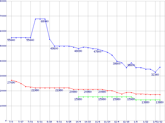 | PC2 3200(DDR2 400) DDR2 SDRAM DIMM ECC対応 Registeredタイプの最安値推移 |