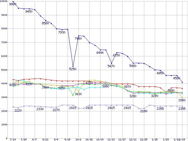 | [↓次グラフ]: | メモリ主要製品(最安値5千円~1万円未満)の最安値推移 |