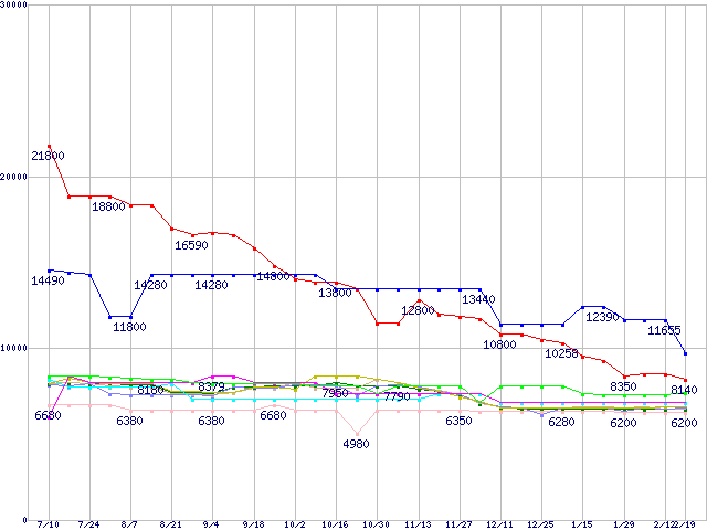 | [↓次グラフ]: | メモリ主要製品(最安値1万円以上)の最安値推移 |