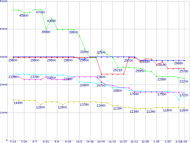 | [↑前グラフ]: | メモリ主要製品(最安値5千円~1万円未満)の最安値推移 |