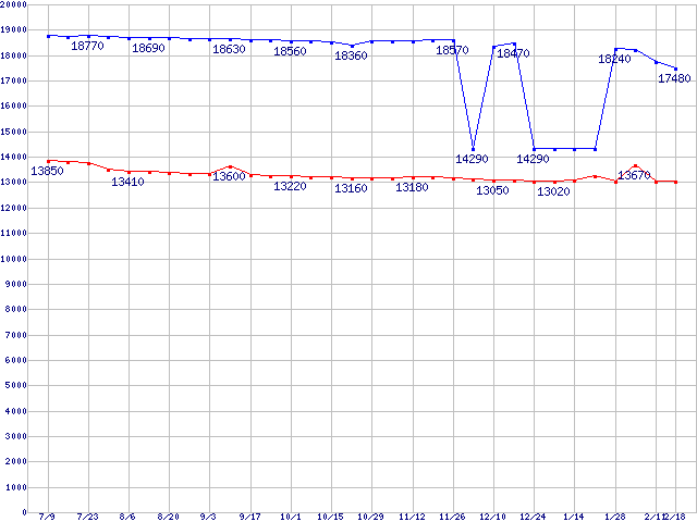 | [↑前グラフ]: | Socket 478 (FC-PGA2,FSB 800MHz,L2 512KB,Hyper-Threading,Northwood)の最安値推移 |