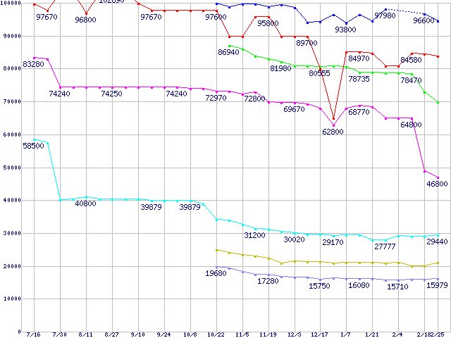 | [↑前グラフ]: | CPU主要製品(最安値6万円以上)の最安値推移 |