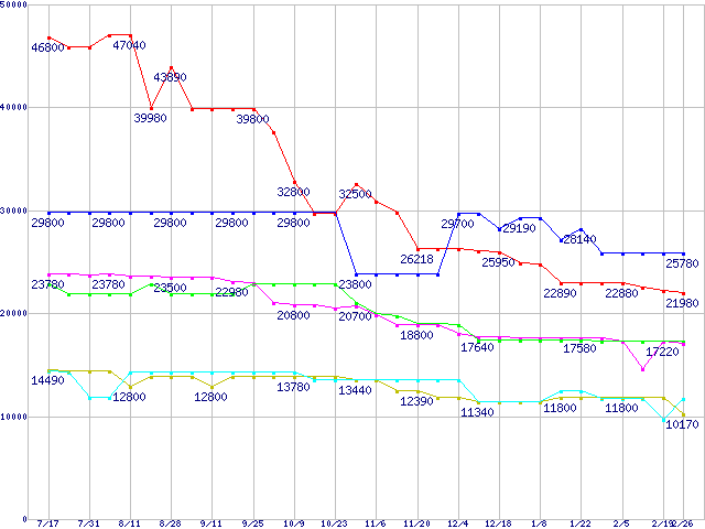 | [↑前グラフ]: | メモリ主要製品(最安値5千円~1万円未満)の最安値推移 |