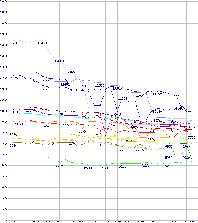 | CPU主要製品(最安値1万円未満)の最安値推移 | | | (2004年7月23日~2005年3月4日) |