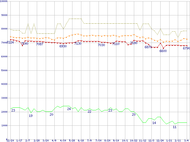 ※このグラフは過去のデータも税率5%相当に調整した税込み相当額のグラフです。 税率変更や、総額表示方式導入(2004年4月)の影響は除いています。 | | | ●凡例 | 最安値 (点線部は販売店未確認 または未調査) | 平均値 | 最高値 | ショップ数 |