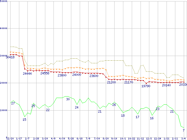 ※このグラフは過去のデータも税率5%相当に調整した税込み相当額のグラフです。 税率変更や、総額表示方式導入(2004年4月)の影響は除いています。 | | | ●凡例 | 最安値 (点線部は販売店未確認 または未調査) | 平均値 | 最高値 | ショップ数 |