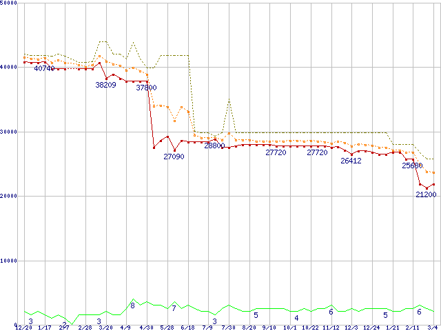 ※このグラフは過去のデータも税率5%相当に調整した税込み相当額のグラフです。 税率変更や、総額表示方式導入(2004年4月)の影響は除いています。 | | | ●凡例 | 最安値 (点線部は販売店未確認 または未調査) | 平均値 | 最高値 | ショップ数 |