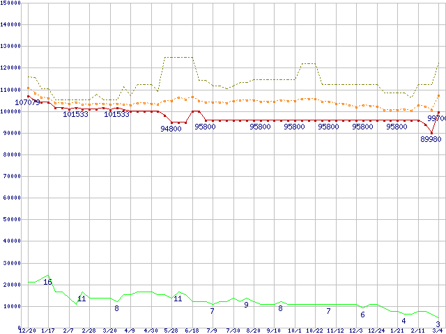 ※このグラフは過去のデータも税率5%相当に調整した税込み相当額のグラフです。 税率変更や、総額表示方式導入(2004年4月)の影響は除いています。 | | | ●凡例 | 最安値 (点線部は販売店未確認 または未調査) | 平均値 | 最高値 | ショップ数 |