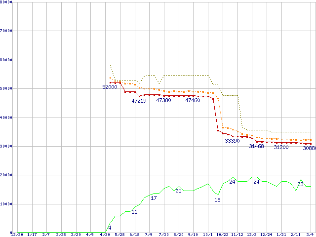 ※このグラフは過去のデータも税率5%相当に調整した税込み相当額のグラフです。 税率変更や、総額表示方式導入(2004年4月)の影響は除いています。 | | | ●凡例 | 最安値 (点線部は販売店未確認 または未調査) | 平均値 | 最高値 | ショップ数 |