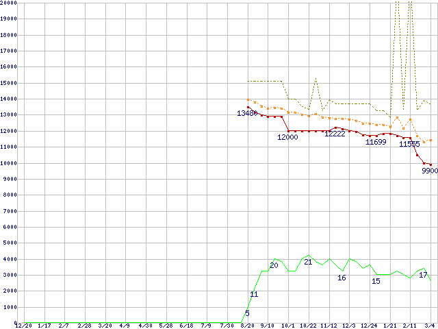 ※このグラフは過去のデータも税率5%相当に調整した税込み相当額のグラフです。 税率変更や、総額表示方式導入(2004年4月)の影響は除いています。 | | | ●凡例 | 最安値 (点線部は販売店未確認 または未調査) | 平均値 | 最高値 | ショップ数 |