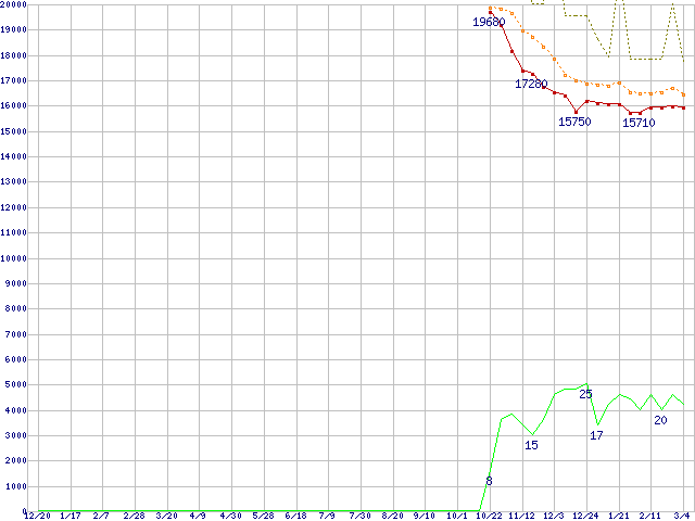 | Athlon 64 3000+(1.8GHz,L2 512KB,socket939) リテールパッケージの価格推移 | | | (2003年12月20日~2005年3月4日) |