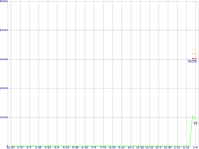 ※このグラフは過去のデータも税率5%相当に調整した税込み相当額のグラフです。 税率変更や、総額表示方式導入(2004年4月)の影響は除いています。 | | | ●凡例 | 最安値 (点線部は販売店未確認 または未調査) | 平均値 | 最高値 | ショップ数 |