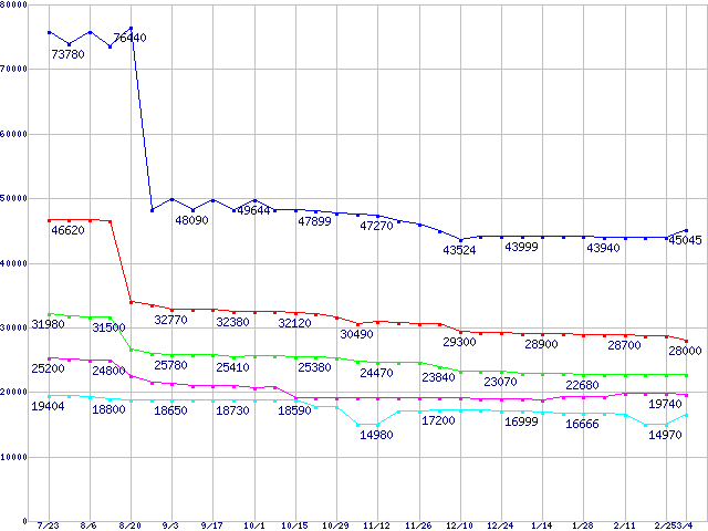 | LGA 775 (FC-LGA4 ,FSB 800MHz,L2 1MB,Hyper-Threading,Prescott)の最安値推移 | | | (2004年7月23日~2005年3月4日) |