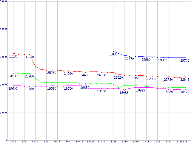 | Socket 478 (FC-PGA2,FSB 800MHz,L2 1MB,Hyper-Threading,Prescott)の最安値推移 | | | (2004年7月23日~2005年3月4日) |
