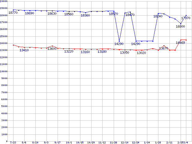 Socket 478 (FC-PGA2,FSB 800MHz,L2 512KB,Hyper-Threading,Northwood)の最安値推移