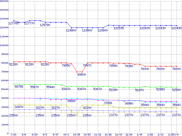 | Socket 604 (micro-PGA,FSB 533MHz,L2 512KB,Prestonia)の最安値推移 | | | (2004年7月23日~2005年3月4日) |