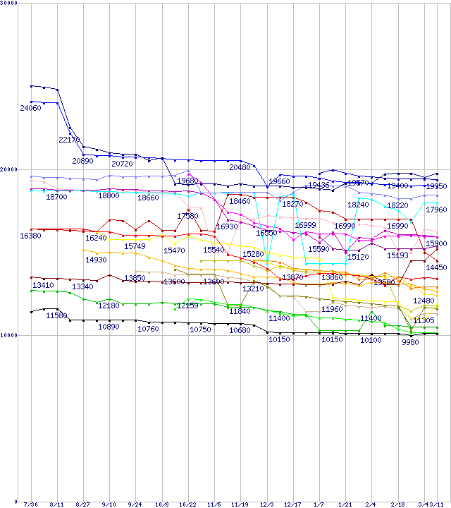 | 凡例 | Pentium 4 530 (3.00GHz) リテールパッケージ | Pentium 4 530J (3GHz) リテールパッケージ | Pentium 4 3E GHz リテールパッケージ | Pentium 4 2.80E GHz リテールパッケージ | Pentium 4 2.80A GHz リテールパッケージ | Pentium 4 520 (2.80GHz) リテールパッケージ | Athlon 64 3000+(1.8GHz,L2 512KB,socket939) リテールパッケージ | Athlon 64 3000+(2GHz,L2 512KB) リテールパッケージ | Celeron M 370 (1.5GHz) リテールパッケージ | Pentium 4 2.40A GHz リテールパッケージ | Athlon XP 3000+ (2.17GHz) リテールパッケージ | Athlon 64 2800+(1.8GHz,L2 512KB) リテールパッケージ | Celeron D 345 (3.06GHz) リテールパッケージ | Sempron 3100+(1.8GHz,L2 256KB,Socket 754) リテールパッケージ | Celeron D 345J (3.06GHz) リテールパッケージ | Celeron M 360 (1.4GHz) リテールパッケージ | Sempron 3000+(2GHz,L2 512KB,Socket A) リテールパッケージ | Celeron D 340J (2.93GHz) リテールパッケージ | Celeron D 340 (2.93GHz) リテールパッケージ | Sempron 3000+(1.8GHz,L2 128KB,Socket 754) リテールパッケージ | Celeron 2.80GHz リテールパッケージ | Celeron D 335J (2.80GHz) リテールパッケージ | Celeron 2.70GHz リテールパッケージ | ※製品名をクリックすると個別のグラフを表示します ※点線部は販売店が確認できなかった、または調査データがないことを示します |