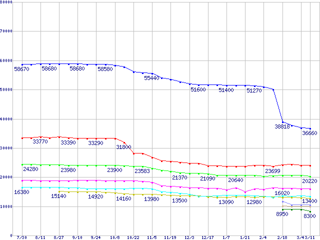 | Socket 754・FSB 800MHzの最安値推移 | | | (2004年7月30日~2005年3月11日) |
