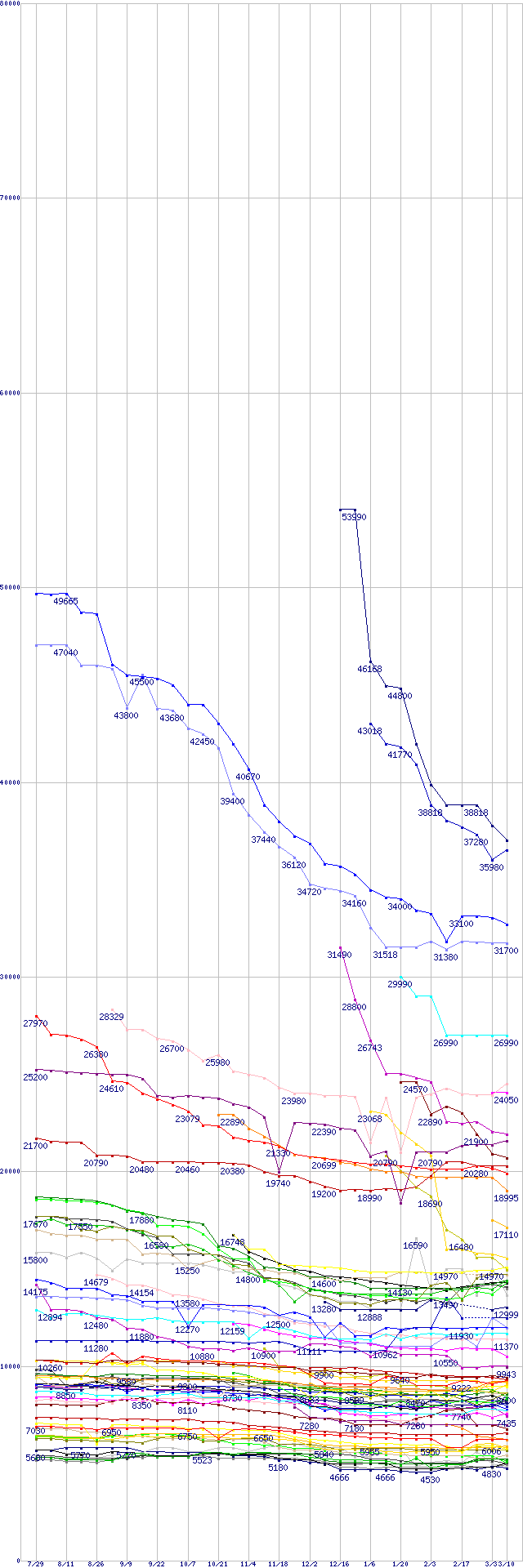 [前グラフ]:HDD主要製品(最安値2万円以上)の最安値推移