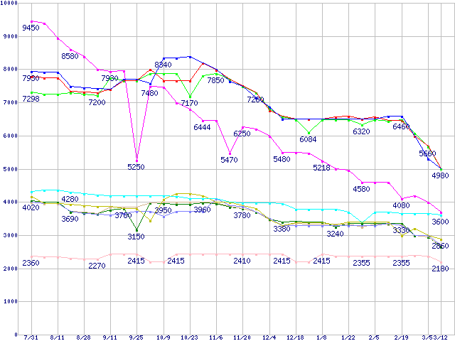 メモリ主要製品(最安値5千円~1万円未満)の最安値推移