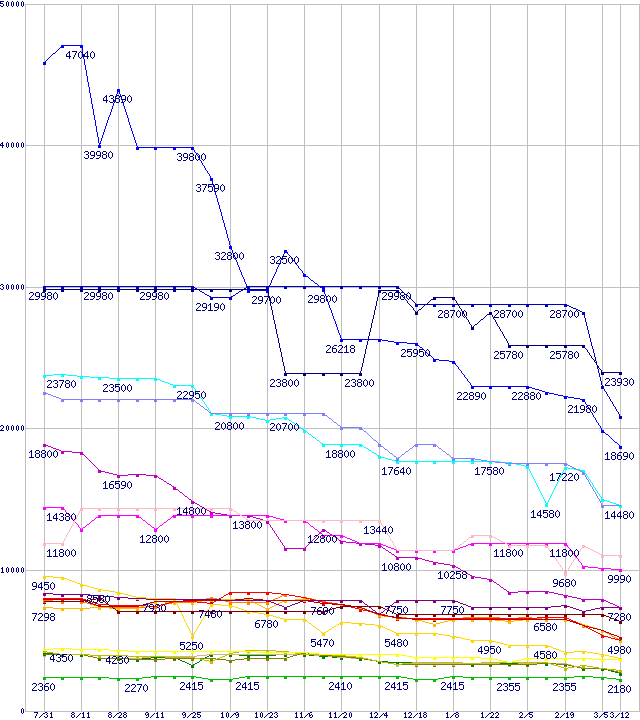 メモリ主要製品(最安値1万円以上)の最安値推移