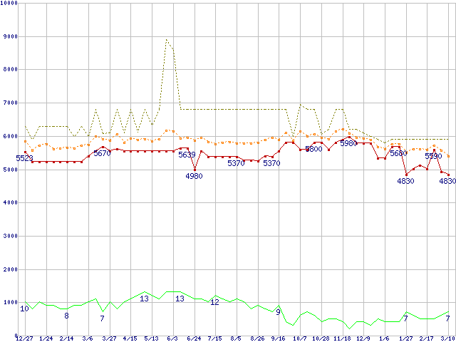 ※このグラフは過去のデータも税率5%相当に調整した税込み相当額のグラフです。 税率変更や、総額表示方式導入(2004年4月)の影響は除いています。 | | | ●凡例 | 最安値 (点線部は販売店未確認 または未調査) | 平均値 | 最高値 | ショップ数 |