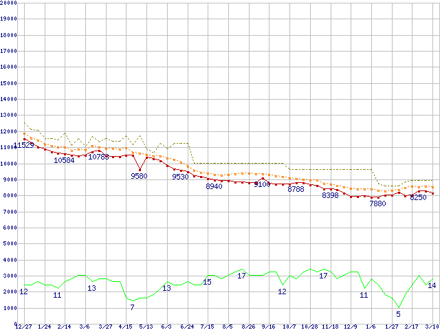 ※このグラフは過去のデータも税率5%相当に調整した税込み相当額のグラフです。 税率変更や、総額表示方式導入(2004年4月)の影響は除いています。 | | | ●凡例 | 最安値 (点線部は販売店未確認 または未調査) | 平均値 | 最高値 | ショップ数 |