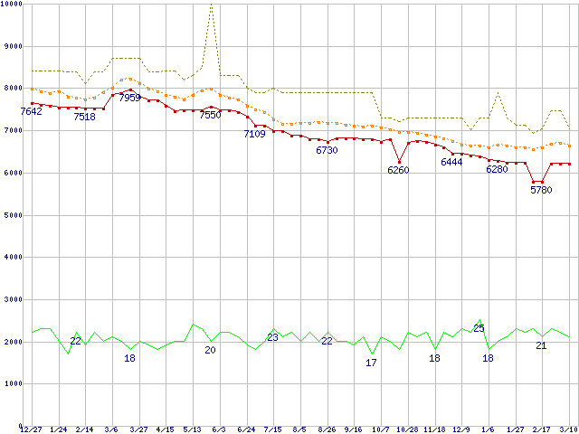 ※このグラフは過去のデータも税率5%相当に調整した税込み相当額のグラフです。 税率変更や、総額表示方式導入(2004年4月)の影響は除いています。 | | | ●凡例 | 最安値 (点線部は販売店未確認 または未調査) | 平均値 | 最高値 | ショップ数 |