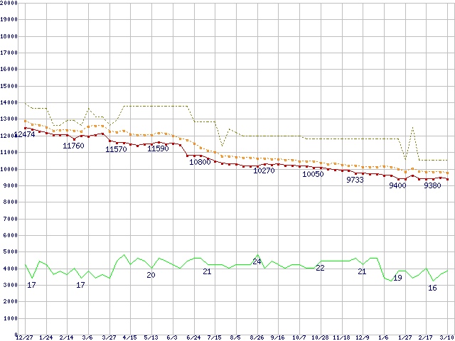 ※このグラフは過去のデータも税率5%相当に調整した税込み相当額のグラフです。 税率変更や、総額表示方式導入(2004年4月)の影響は除いています。 | | | ●凡例 | 最安値 (点線部は販売店未確認 または未調査) | 平均値 | 最高値 | ショップ数 |