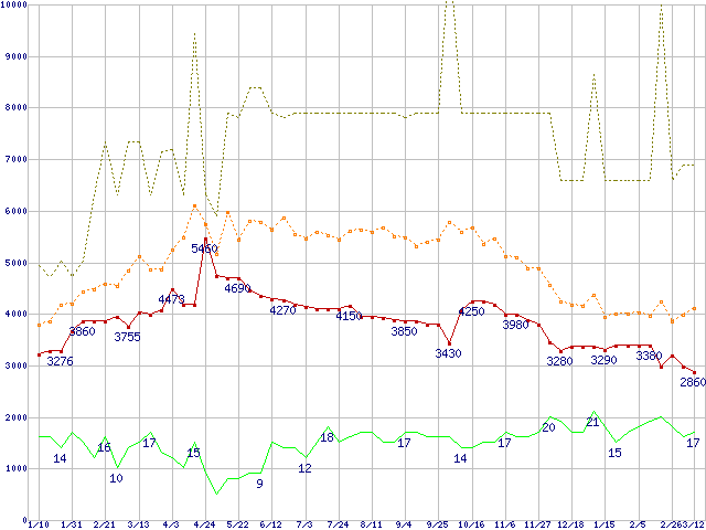 PC3200(DDR400) DDR SDRAM DIMMの最安値推移