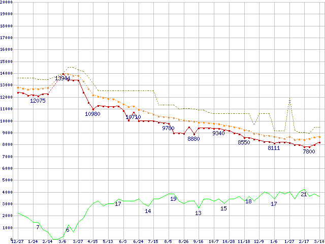 ※このグラフは過去のデータも税率5%相当に調整した税込み相当額のグラフです。 税率変更や、総額表示方式導入(2004年4月)の影響は除いています。 | | | ●凡例 | 最安値 (点線部は販売店未確認 または未調査) | 平均値 | 最高値 | ショップ数 |