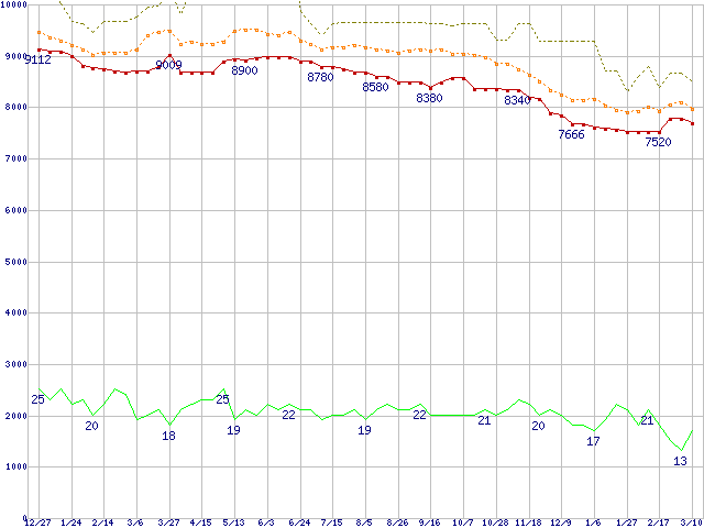 ※このグラフは過去のデータも税率5%相当に調整した税込み相当額のグラフです。 税率変更や、総額表示方式導入(2004年4月)の影響は除いています。 | | | ●凡例 | 最安値 (点線部は販売店未確認 または未調査) | 平均値 | 最高値 | ショップ数 |