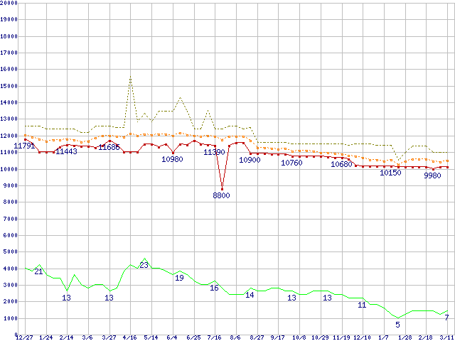 ※このグラフは過去のデータも税率5%相当に調整した税込み相当額のグラフです。 税率変更や、総額表示方式導入(2004年4月)の影響は除いています。 | | | ●凡例 | 最安値 (点線部は販売店未確認 または未調査) | 平均値 | 最高値 | ショップ数 |