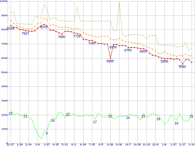 | Deskstar 7K250 HDS722580VLSA80 (80GB,8MB)の価格推移 | | | (2003年12月27日~2005年3月10日) |