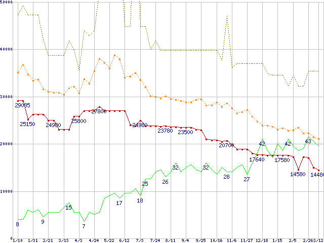 ※このグラフは過去のデータも税率5%相当に調整した税込み相当額のグラフです。 税率変更や、総額表示方式導入(2004年4月)の影響は除いています。 | | | ●凡例 | 最安値 (点線部は販売店未確認 または未調査) | 平均値 | 最高値 | ショップ数 |