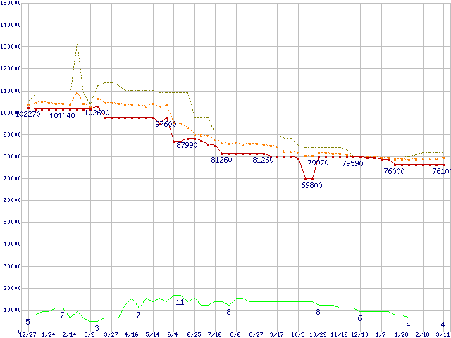 ※このグラフは過去のデータも税率5%相当に調整した税込み相当額のグラフです。 税率変更や、総額表示方式導入(2004年4月)の影響は除いています。 | | | ●凡例 | 最安値 (点線部は販売店未確認 または未調査) | 平均値 | 最高値 | ショップ数 |