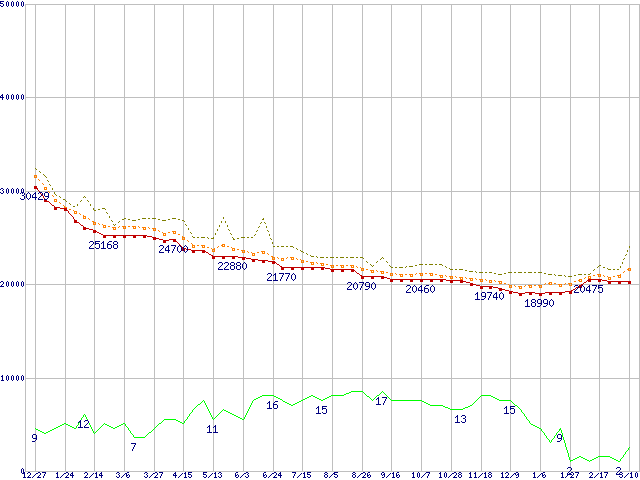 ※このグラフは過去のデータも税率5%相当に調整した税込み相当額のグラフです。 税率変更や、総額表示方式導入(2004年4月)の影響は除いています。 | | | ●凡例 | 最安値 (点線部は販売店未確認 または未調査) | 平均値 | 最高値 | ショップ数 |