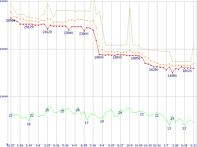 ※このグラフは過去のデータも税率5%相当に調整した税込み相当額のグラフです。 税率変更や、総額表示方式導入(2004年4月)の影響は除いています。 | | | ●凡例 | 最安値 (点線部は販売店未確認 または未調査) | 平均値 | 最高値 | ショップ数 |