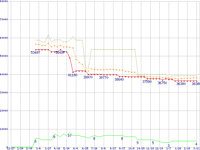 ※このグラフは過去のデータも税率5%相当に調整した税込み相当額のグラフです。 税率変更や、総額表示方式導入(2004年4月)の影響は除いています。 | | | ●凡例 | 最安値 (点線部は販売店未確認 または未調査) | 平均値 | 最高値 | ショップ数 |
