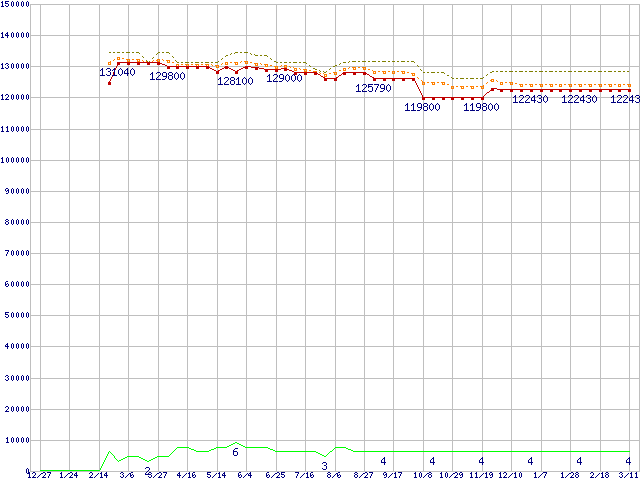 ※このグラフは過去のデータも税率5%相当に調整した税込み相当額のグラフです。 税率変更や、総額表示方式導入(2004年4月)の影響は除いています。 | | | ●凡例 | 最安値 (点線部は販売店未確認 または未調査) | 平均値 | 最高値 | ショップ数 |