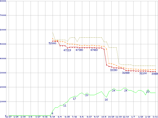 ※このグラフは過去のデータも税率5%相当に調整した税込み相当額のグラフです。 税率変更や、総額表示方式導入(2004年4月)の影響は除いています。 | | | ●凡例 | 最安値 (点線部は販売店未確認 または未調査) | 平均値 | 最高値 | ショップ数 |