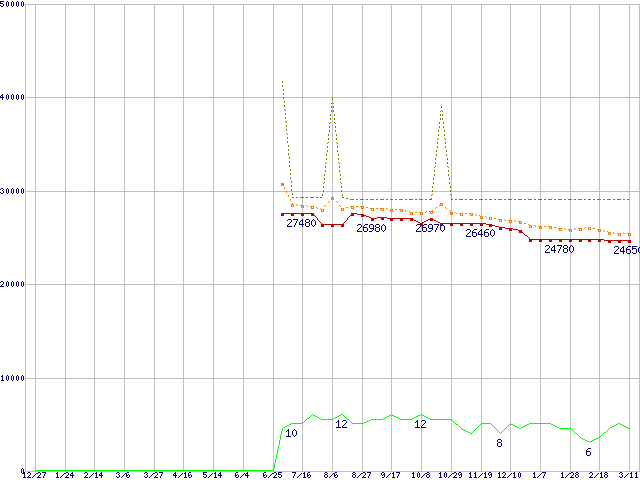 ※このグラフは過去のデータも税率5%相当に調整した税込み相当額のグラフです。 税率変更や、総額表示方式導入(2004年4月)の影響は除いています。 | | | ●凡例 | 最安値 (点線部は販売店未確認 または未調査) | 平均値 | 最高値 | ショップ数 |