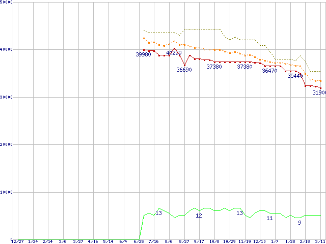※このグラフは過去のデータも税率5%相当に調整した税込み相当額のグラフです。 税率変更や、総額表示方式導入(2004年4月)の影響は除いています。 | | | ●凡例 | 最安値 (点線部は販売店未確認 または未調査) | 平均値 | 最高値 | ショップ数 |