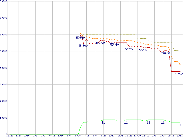 ※このグラフは過去のデータも税率5%相当に調整した税込み相当額のグラフです。 税率変更や、総額表示方式導入(2004年4月)の影響は除いています。 | | | ●凡例 | 最安値 (点線部は販売店未確認 または未調査) | 平均値 | 最高値 | ショップ数 |