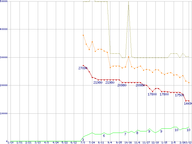 PC2 3200(DDR2 400) DDR2 SDRAM DIMM ECC対応 Registeredタイプの最安値推移