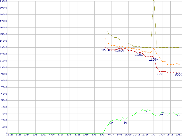 | Celeron M 350 (1.3GHz) リテールパッケージの価格推移 | | | (2003年12月27日~2005年3月11日) |