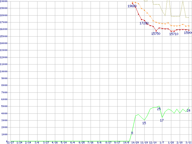 | Athlon 64 3000+(1.8GHz,L2 512KB,socket939) リテールパッケージの価格推移 | | | (2003年12月27日~2005年3月11日) |