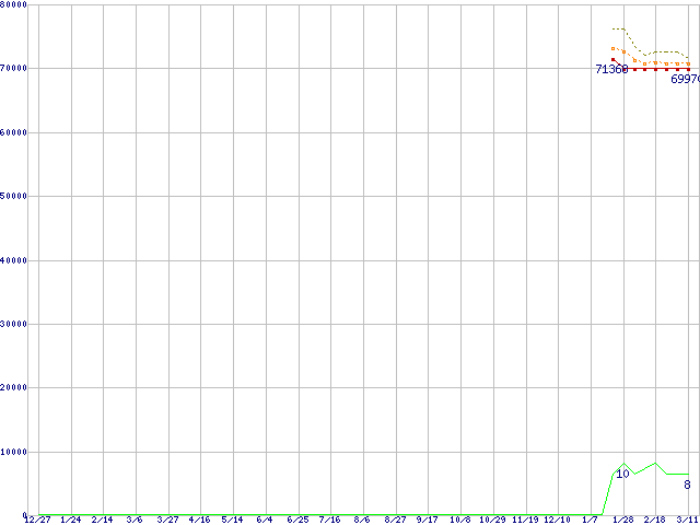 ※このグラフは過去のデータも税率5%相当に調整した税込み相当額のグラフです。 税率変更や、総額表示方式導入(2004年4月)の影響は除いています。 | | | ●凡例 | 最安値 (点線部は販売店未確認 または未調査) | 平均値 | 最高値 | ショップ数 |